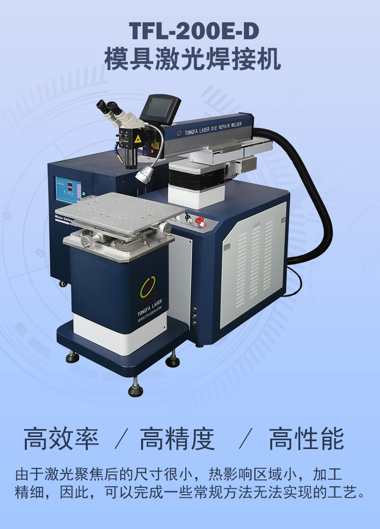 出口型模具激光焊機是通發激光公司專門為出口國外客戶使用而設計的系列機型TFL-200E,適用于各類精密注塑模具、壓鑄模具等模具激光修補焊接;同時也適合鑄件沙孔激光修補、模具崩缺激光修復、過切加工等的激光修補;各類金屬結構件、金銀首飾的激光焊接加工。